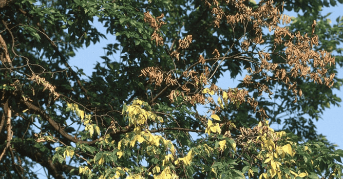 Early symptoms of DED include wilting, yellowing, and curling leaves, commonly referred to as "flags”, which indicate the disease’s presence within the tree.